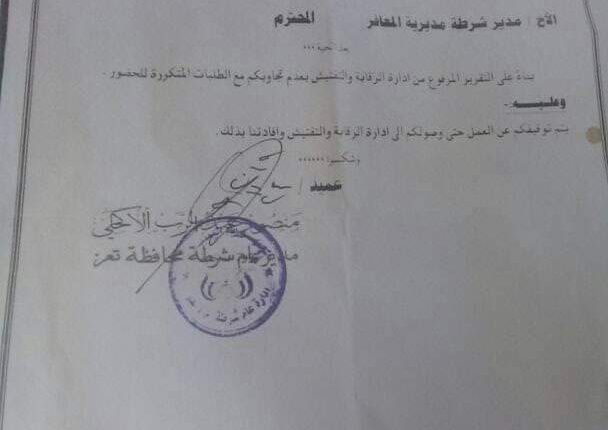 اصدر مدير شرطة محافظة تعز منصور الاكحلي امر توقيف بحق مدير شرطة المعافر مختار التميمي المحسوب على حزب المؤتمر الشعبي العام .