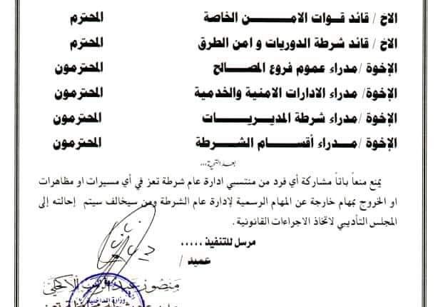 وجه مدير شرطة تعز منصور الاكحلي التابع للشرعية ،جميع الجهات التابعة لإدارة شرطة المحافظة بمنع مشاركة اي فرد من منتسبي الامن في اي مسيرات او مظاهرات او الخروج بمهام خارجة عن المهام الرسمية لإدارة عام الشرطة.