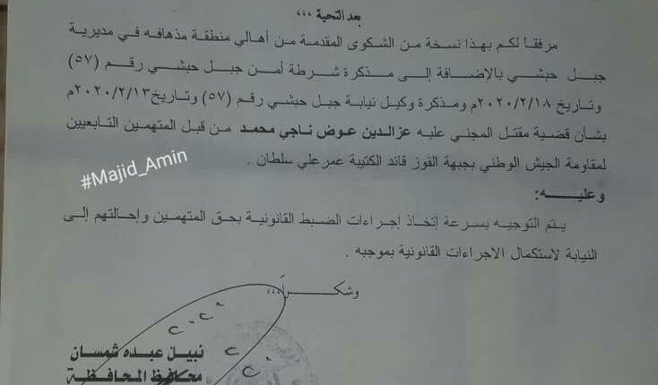 واكد شمسان، في مذكرته التي جاءت كاستجابة لشكوى ابناء جبل حبشي، على سرعة اتخاذ الإجراءات لضبط المتهمين في حادثة القتل واحالتهم الى النيابة لاستكمال الإجراءات القانونية.