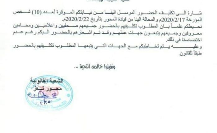 واكتفى محور تعز في الوثيقة الصادرة من الشعبة القانونية التابعة للمحور في رده على أمر النيابة الجزائية ، بأخطار المطلوب احضارهم في مقر عملهم.