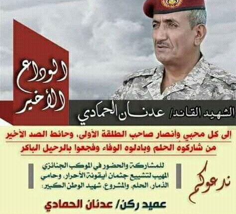 قالت اللجنة المنظمة لمراسيم تشييع قائد اللواء 35 مدرع، عدنان الحمادي، ان جثمانه سيصل يوم غدا الخميس من العاصمة المؤقتة عدن الى مدينة التربة، جنوبي تعز.