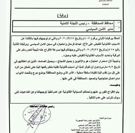 وحمل شمسان إدارة الأمن السياسي المسؤولية القانونية عن عدم تنفيذ توجيهاته وعن التداعيات التي سوف تترتب عليها.