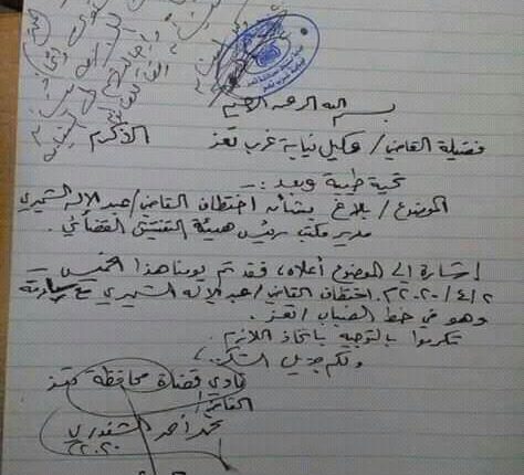 اختطاف احد القضاة في تعز، اليوم الخميس، بعد ساعات من بيان نادي القضاء المطالب بإقالة رؤساء السلطة المحلية والأمنية والعسكرية في المحافظة بسبب الانتهاكات التي تمارس ضد القضاء.