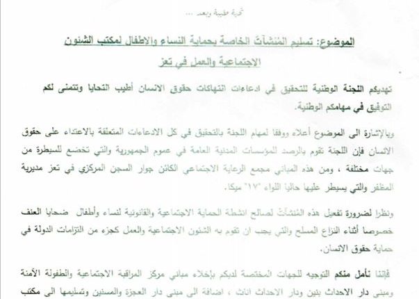 كشفت وثائق ومعلومات حول قيام اللجنة الوطنية للتحقيق في ادعاءات انتهاكات حقوق الانسان بمطالبة محور تعز بأخلاء القوات العسكرية المتمركزة في مبنى الرعاية الاجتماعية بجانب السجن المركزي في المدينة الذي تم استهدافه امس الاحد بقذيفه على سجن النساء .
