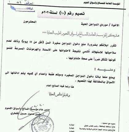 اصدرت المؤسسة العامة للمسالخ في تعز، الاثنين، تعميم يمنع دخول الدواجن صغيرة السن.
