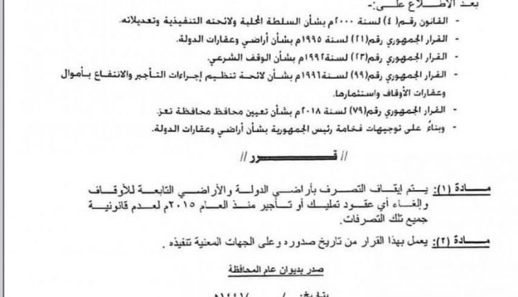 ونص القرار ، الذي اُصدر من قبل محافظ المحافظة نبيل شمسان، حصل “تعز اليوم” نسخة منه ، على ” إيقاف التصرف بأراضي الدولة والأراضي التابعة للأوقاف وإلغاء أي عقود تمليك أو تأجير منذ العام 2015 م لعدم قانونية تلك التصرفات.