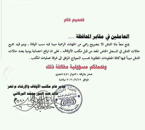 وجه مكتب الأوقاف والارشاد بمدينة تعز، السبت، بمنع دفن جثث المتوفين إلا بتصريح دفن رسمي.