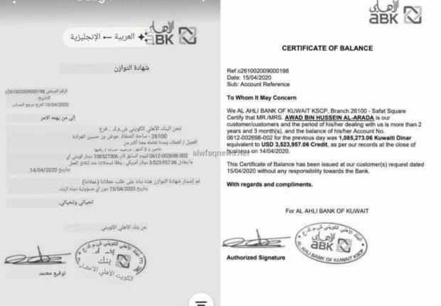 بحسب وثيقة صادرة عن البنك الأهلي الكويتي في مدينة الكويت فإن العرادة يملك في حسابه البنكي في رقم 002-002698-0612 مبلغ 1,085,273 دينار كويتي (مليون و85 ألف و 273 دينار كويتي)