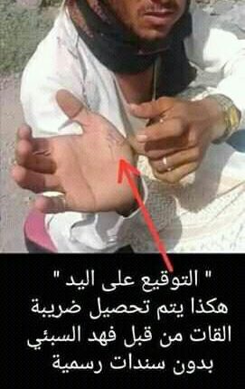 وتظهر الصورة التي التقطها الصحفي محمد مارش ونشرها على حسابه ب”فيسبوك”، أحد بائعي القات وقد كتب على يده علامة لتحصيل المالي من مسؤول التحصيل دون أي سند رسمي.