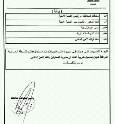وجاء في المذكرة، الصادرة عن شمسان والموقعه بتاريخ 28 / 6/ 2020، مايلي : نتيجة للتطورات التي حدثت في مديرية الشمايتين فقد تم استبدال اطقم الشرطة العسكرية المرافقة للجان تحصيل ضرائب القات في مديرية الشمايتين باطقم الشرطة العسكرية.
