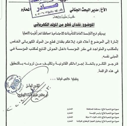 وأخطرت المؤسسة العامة للتأمنيات الإجتماعية، في مذكرة رسمية، إدارة البحث الجنائي في مدينة تعز عن فقدانها قطع من المولد الكهربائي الخاص بالمكتب المتواجد في حوش المؤسسة نفسه الكائنة وسط مدينة تعز، مطالبة أيها بالتحقيق.