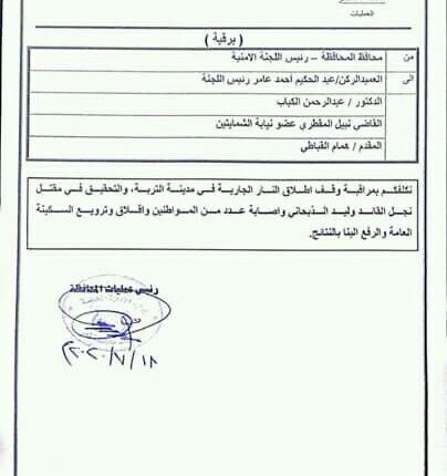 ووجه شمسان اللجنة بالتحقيق في مقتل نجل أركان تدريب اللواء 35 مدرع حبيب وليد الذبحاني والإشتباكات التي شهدتها مدينة التربة يوم أمس السبت.