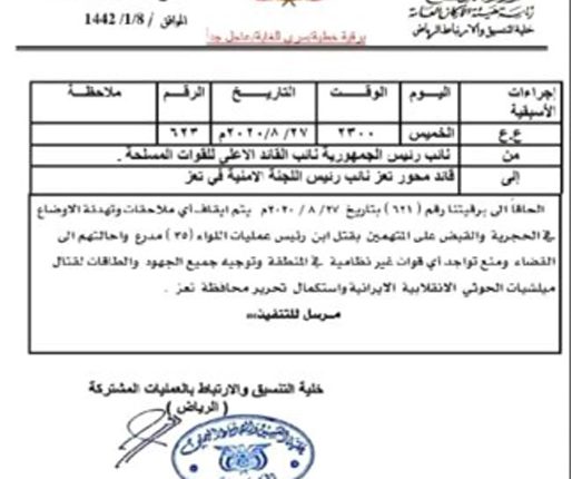 وجاءت البرقية الموجهة من علي محسن الأحمر، عطفاً على برقية سابقة بتاريخ 27/ 8/ 2020م وهو نفس التاريخ الذي شنت فيه قوات المحور حملة انتهاكات واقتحامات طالت منازل عديد من ضباط وقيادة اللواء 35 مدرع المناوئة للإصلاح بمن فيهم منزل العميد عدنان الحمادي.