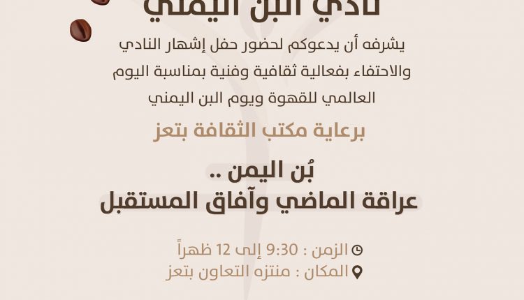 دعا نادي البن اليمني للتراث والثقافة جميع سكان مدينة تعز إلى مشاركته حفل إشهار النادي والذي سيقام يوم غدا الخميس الموافق الأول من شهر أكتوبر في نادي تعز السياحي وسط مدينة تعز