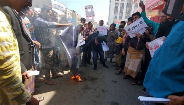 شارك العشرات من أبناء تعز، الأحد، في وقفة احتجاجية غاضبة منددة لإساءة الرئيس الفرنسي إيمانويل ماكرون بحق الإسلام والنبي الأكرم