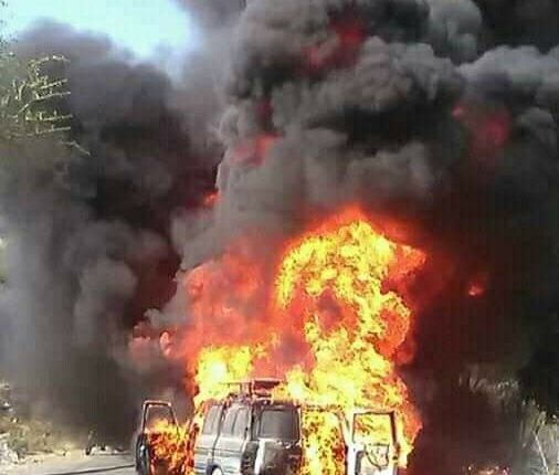 احترقت سيارة محملة بالمشتقات النفطية، الأربعاء، في مديرية جبل حبشي غربي تعز