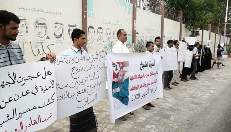 نفذت أسرة المختطف الشيخ “عبد القادر الشيباني”، الأربعاء، وقفة احتجاجية أمام مقر السلطات المحلية في عدن مطالبة بسرعة اطلاق سراحه