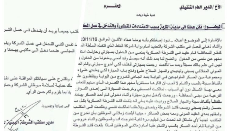 وأفادت الرسالة عن تعرض مدير فرع الشركة لتهجم من قبل مدير فرع الأمن السياسي العقيد عبد الواحد سرحان أثناء أحد الاجتماعات مع الموظفين وتهديده أمامهم