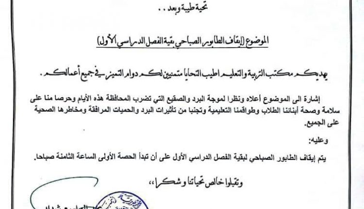 ونص التعميم  على “إيقاف الطابور المدرسي طيلة التفرة المتبقية من الفصل الدراسي الأول، حرصا على سلامة الطلاب والفرق التعليمية من تأثيرات البرد والحميات المرافقة”.