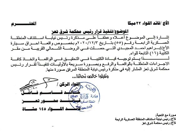 وكانت النيابة العسكرية قد كلفت قائد محور تعز بالاستجابة لقرار محكمة شرق القاضية بالتحقيق في إحراق سيارة أمين سر محكمة شرق تعز إبراهيم أحمد المجيدي، بالقرب من مستشفى طيبة بحي الروضة شمالي شرق مدينة تعز.