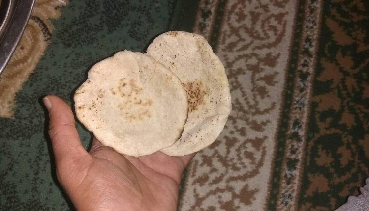 الصورة لحجم رغيف الخبز الذي يباع في السوق السوداء بالمدينة وبسعر يتراوح بين 30-50 ريال.