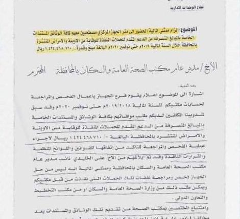 واكد المصدر بان مكتب الصحة طلب من الجهاز المركزي مهلة لتقديم الوثائق والدلائل ،لإثبات شفافيته وحسن التنفيذ.