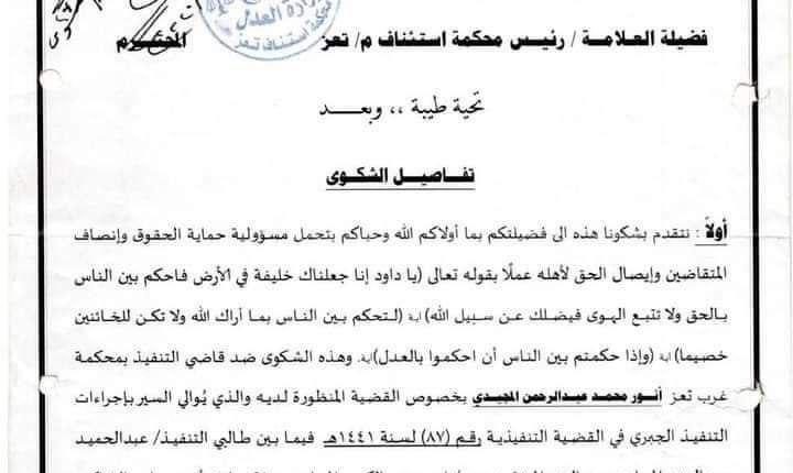 وبحسب الوثيقة المسربة، فإن القاضي أنور المجيدي تمرد على قرارات وتوجهيات رئيس محكمة استئناف تعز، بتسليم نسخة من الطعن في حكم بحق أرضية ومنزل يمتلكهما المواطن صادق أمين عباس في حي وادي القاضي شمال تعز.