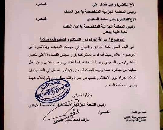 أصدرت سلطة الشرعية، الثلاثاء، قرارا بتغيير رئيس محكمة المحكمة الجزائية المختصة فيعدن عقب كشفه ممارسة ضغوط ضد القضاء لتمييع قضية اغتيال قائد اللواء 35 مدرع عدنان الحمادي.