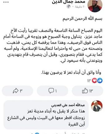 فيما علق الشيخ الديني العديني، المعروف بتشدده، على منشور جمال بالقول ” هذا منكر لن يرضاه أبناء تعز، تناول وجبتك بالبيت وليس بالشارع”.