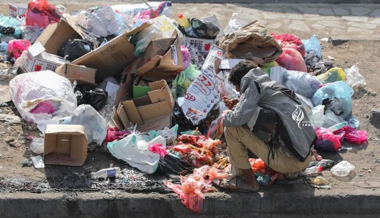 وتداول النشطاء صورة مؤلمة لاحد طلبة المدارس في مدينة تعز ، وهو منهمل بالأكل من احد اكياس القمامة ليسد جوعة بعد انهاء حصصه المدرسية .