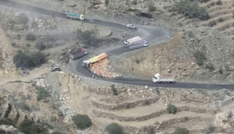 انقلاب شاحنة تجارية في نقيل ظمران جنوب تعز