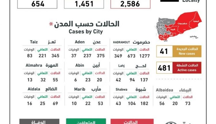 وقالت اللجنة الوطنية، إنها سجلت 41 حالة جديدة، منها 21 حالة في حضرموت، و ٩ حالات في عدن، وخمس في المهرة، ثلاث حالاتفي تعز ثلاث اصابات في محافظة شبوة .
