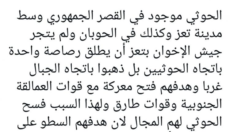 وقال وضاح عطية، عضو ما يسمى الجمعية الوطنية الجنوبية، في تغريده على “تويتر”، الحوثي موجود في القصر الجمهوري وسط مدينة تعز وكذلك في الحوبان ولم يتجر جيش الإخوان بتعز أن يطلق رصاصة واحدة في اتجاه الحوثيين بل ذهبوا باتجاه الجبال غربا وهدفهم فتح معركة مع قوات العمالقة الجنوبية وقوات طارق”.
