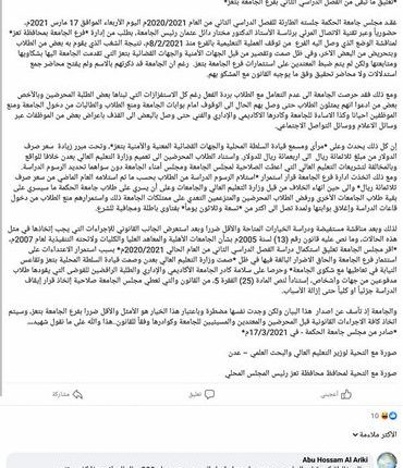 ادان المجلس الطلابي لطلاب جامعة الحكمة في تعز، الخميس، قرار تعليق الدراسة الذي اتخذته إدارة الجامعة، موكدا على استمرار الطلاب في التصعيد السلمي واللجوء إلى القضاء.