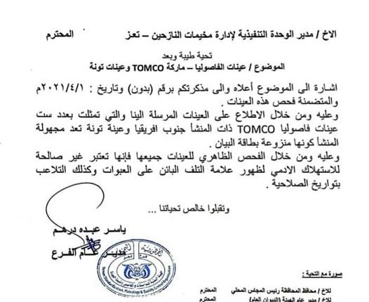 وأكدت الهيئة ، في مذكرة رسمية أرسلتها إلى الوحدة التنفيذية لإدارة مخيمات النازحين، ان العينات المرسلة إليها للفحص غير صالحة للاستخدام الآدمي، وأظهر الفحص الظاهري عليها عن تلفٍ في العبوات، وتلاعبٍ في تواريخ الصلاحية”.