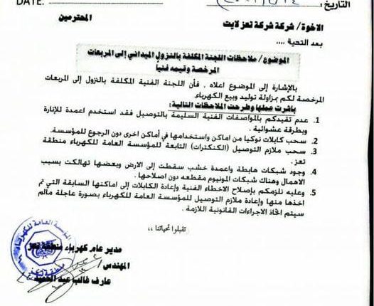 وفي الوثيقة طالبت مؤسسة الكهرباء الشركات الخاصة باعادة ملازم التوصيل الخاصة بالمؤسسة بصورة عاجلة وتحمل كامل المسؤولية القانوينة .