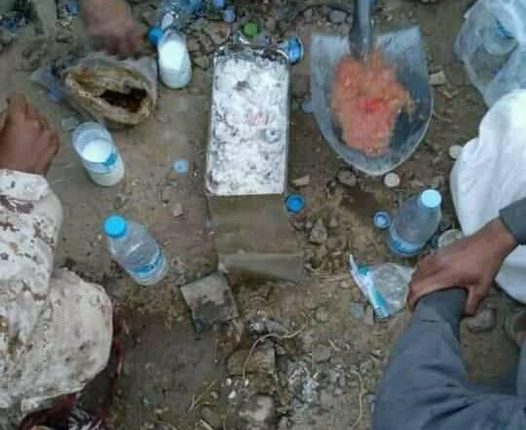 وتظهر الصورة تجمع مجموعة من أفراد جيش الشرعية المرابطين بأحد مواقع القتال في جبهات تعز على مائدة الإفطار المكونة من الشفوت (وجبة شعبية)، مستخدمين أدوات البناء (كريك) وصفيحة الذخائر كأطباق وفي ظروف غير صحية”.