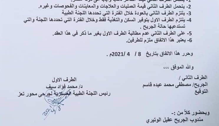 وتظهر الوثيقة المؤرخة في ال8 من شهر أبريل الجاري وتحمل عنوان محضر اتفاق بين اللجنة الطبية العسكرية لجرحى محور تعز وموقع عليها رئيسها د. محمد فؤاد سيف والطرف الثاني الجريح محمد عبده قاسم والذي تحفظ على توقيع الاتفاق.