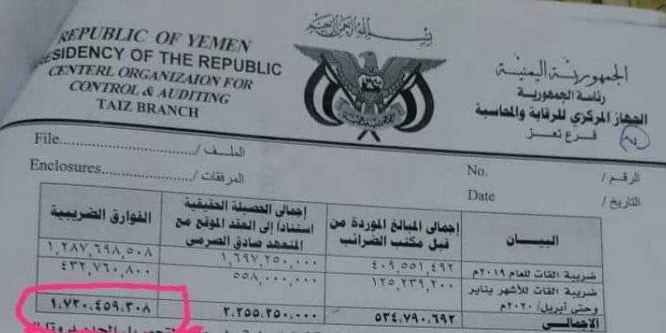 الوثيقة الصادرة من الجهاز المركزي للرقابة والمحاسبة في تعز والتي تداولها ناشطون على مواقع التواصل توضح بيان للجهاز في ملف ضريبة القات خلال عام 2019 وحتى شهر أبريل من عام 2020، ولا يدخل فيها مقدار الجبايات التي تفرض على بائعي القات والمواطنين من قبل النقاط العسكرية بدون أي سندات رسمية وبشكل غير قانوني.
