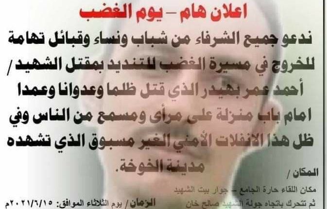 دعا ناشطون جميع أهالي تهامة للمشاركة بيوم غضب يوم غدا الثلاثاء تنديدا بمقتل الشاب أحمد بهيدر على يد القوات المدعومة إماراتيا نهاية الأسبوع الماضي والانفلات الأمني الذي تعيشه مدينة الخوخة جنوبي الحديدة.