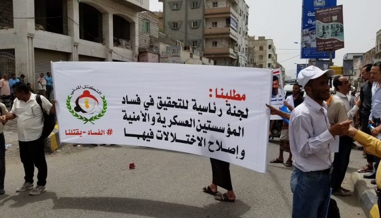 وجدد المشاركون في التظاهرة التي دعا لها نظمها التكتل المدني (تم) أمام مقر السلطة المحلية تمسكها بمطالب الحراك الشعبي كاملة والتي يأتي إقالة قيادة السلطة ومحاسبتهم وإحالة ملفات الفاسدين للنيابة والكشف عن مصير المخفيين قسرا في سجون الفصائل المسلحة.