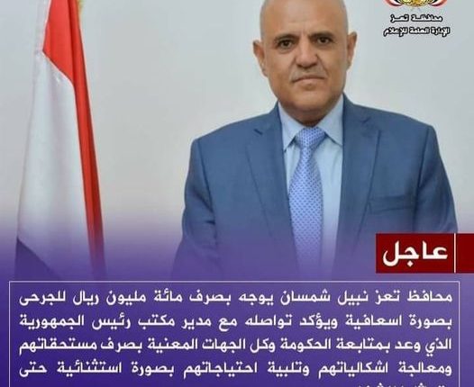 ووجه شمسان بصرف مبلغ مائة مليون ريال لصالح الجرحي، حسب الإدارة العامة للإعلام التابعة للمحافظة، في حين كشفت مصادر محلية أن المبلغ الذي وجه به شمسان من رصيد الاستقطاعات التي فرضت على مكاتب السلطة المحلية لصالح الجرحى الشهر الماضي.