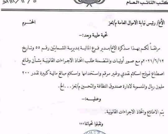 وجاءت مذكرة المحامي العام عطفاً على مذكرة بلاغ صادرة من مكتب المالية بمديرية الشمايتين صادرة بتاريخ 12/6/2021، تفضح استغلال المكاتب التنفيذية في تحصيل الاموال الحكومية دون توريدها لمكتب المالية .