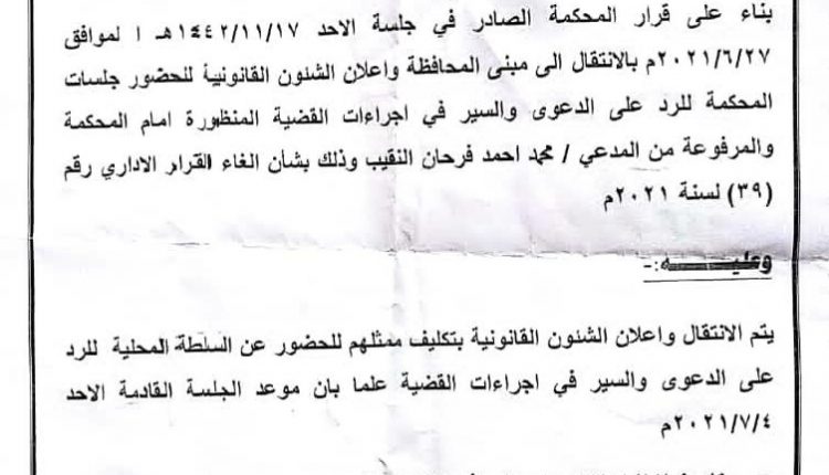 وكشفت وثيقة صادرة من محكمة غرب تعز بتاريخ يوم امس 28/6/2021،باعلان مكتب الشؤون القانونية بالمحافظة بتكليف من يمثله للحضور والرد على الدعوة المقدمة من مدير مكتب النقل المقال محمد احمد النقيب المحسوب على الاصلاح، المطالب بإلغاء قرار الاقالة رقم (29) الصادر من المحافظ المؤتمري نبيل شمسان،كونه غير قانوني .