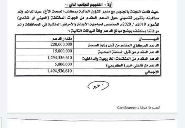 وتفيد الوثيقة الصادرة عن لجنة تقييم مكتب الصحة بمحافظة تعز عن نهب ما مقدره مليار ونصف المليار من خزينة مكتب الصحة المخصصة لمواجهة الأوبئة بمحافظة تعز المقدمة من المنظمات لصالح هوامير وعصابات الفساد.