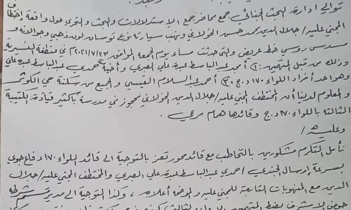 وذكرت الوثيقة الموجهة إلى مدير شرطة تعز  أن الناشط جلال الدين الخولاني، تم اختطافه قبل أسبوع من قبل ثلاثة متهمين على رأسهم جندي في اللواء 170 دفاع جوي، يدعى حمدي عبدالباسط عبده علي، وقاموا  باقتياده إلى سجن خاص بالكتيبة الثالثة باللواء المتمركزة بمدرسة باكثير.