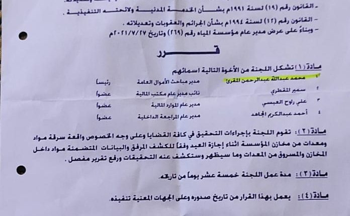 تشكيل لجنة للتحقيق في المعدات التابعة لمؤسسة المياه المنهوبة من قبل افراد تابعين لمحور تعز