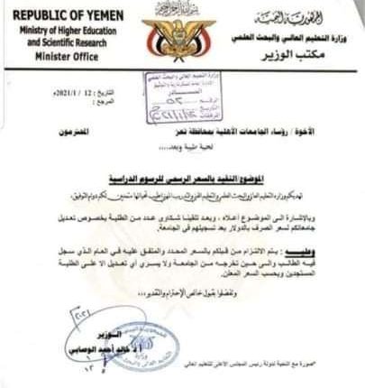وأفاد طلبة في الجامعة ، بان ادارة جامعة العلوم والتكنلوجيا (المملوكه لقيادات في حزب الإصلاح) رفعت سعر صرف الدولار الى 500 ريال، و لم تتقيد بتوجيهات وزارة التعليم العالي في حكومة المناصفة ،بتثبيت سعر الصرف في الجامعات الخاصة بحسب العام الذي سجل فيه الطالب .