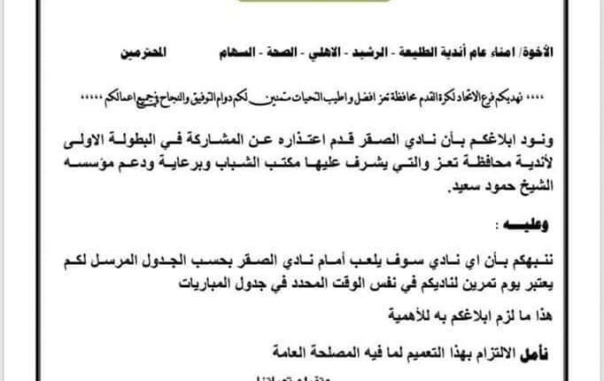 وافادة مذكرة صادرة عن اتحاد كرة القدم فرع تعز ،بان نادي الصقر قد اعتذر عن المشاركة في البطولة الأولى لاندية المحافظة .