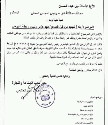 وأوضح مدير مكتب التجارة والصناعة، عدنان الحكيمي، في بلاغ بعثه إلى محافظ المحافظة نبيل شمسان والأجهزة الأمنية، أنه تعرض للتهديد من قبل القيادي في الإصلاح ورئيس رابطة الجرحى المدعو “فهد هزبر”.